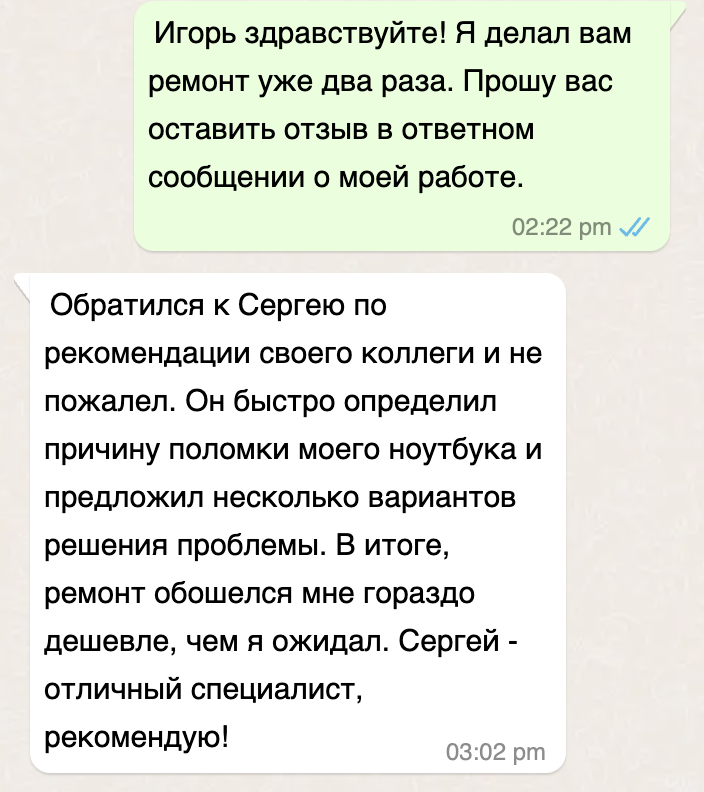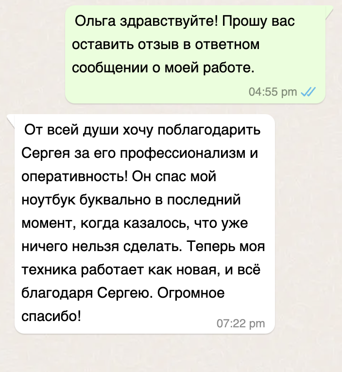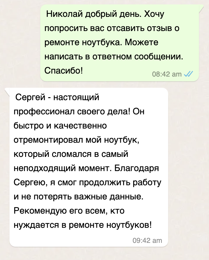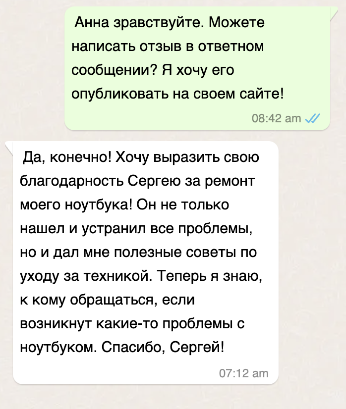 Меня зовут Сергей, я чиню ноутбуки и помогаю с компьютерами. У меня большой опыт, и я могу помочь с любыми проблемами вашего ноутбука.
