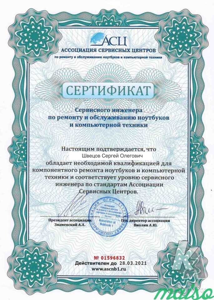 Я чиню все модели и марки ноутбуков, так что не волнуйтесь, ваш ноутбук будет в хороших руках. У меня есть все нужные сертификаты, и я работаю официально, так что качество моей работы гарантировано.